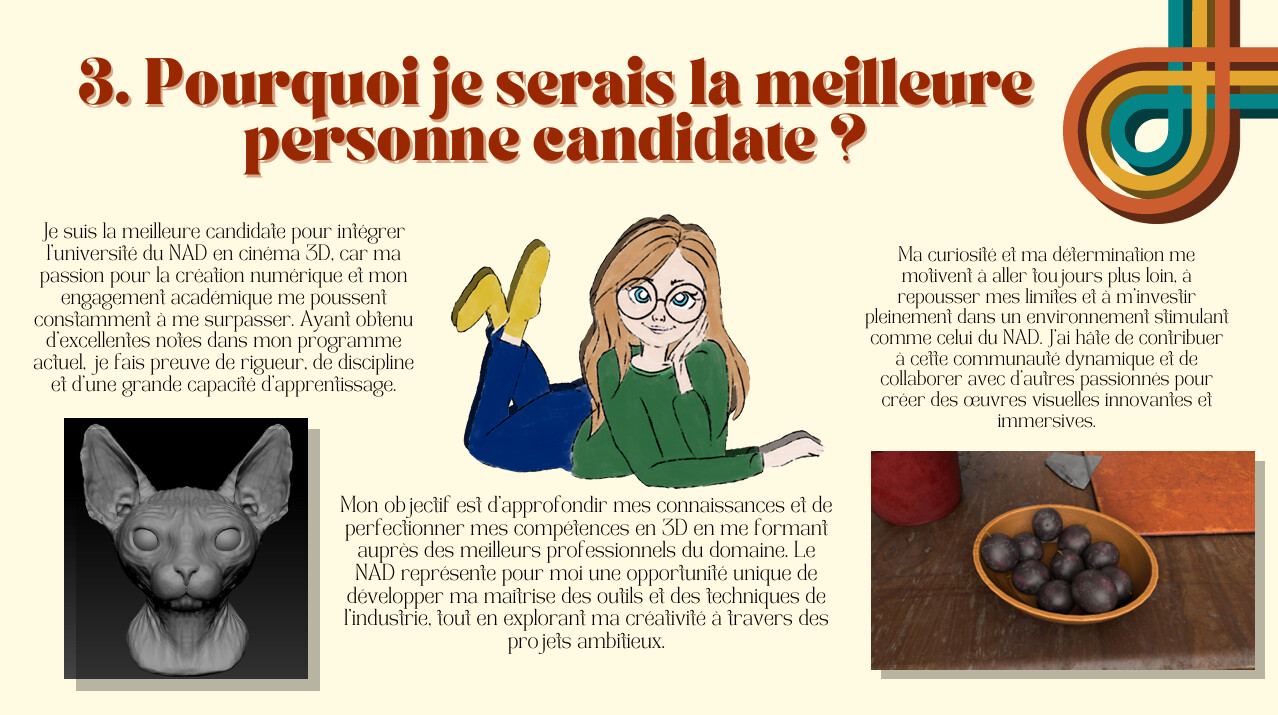 Le portfolio est la vitrine de vos compétences artistiques pour démontrer votre créativité. Il reflète non seulement votre maîtrise technique, mais aussi votre vision artistique.